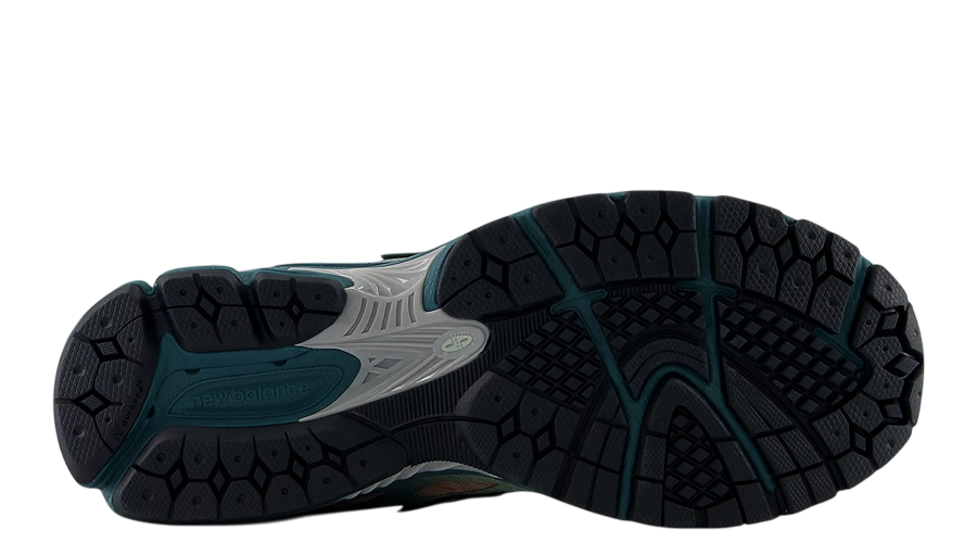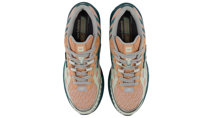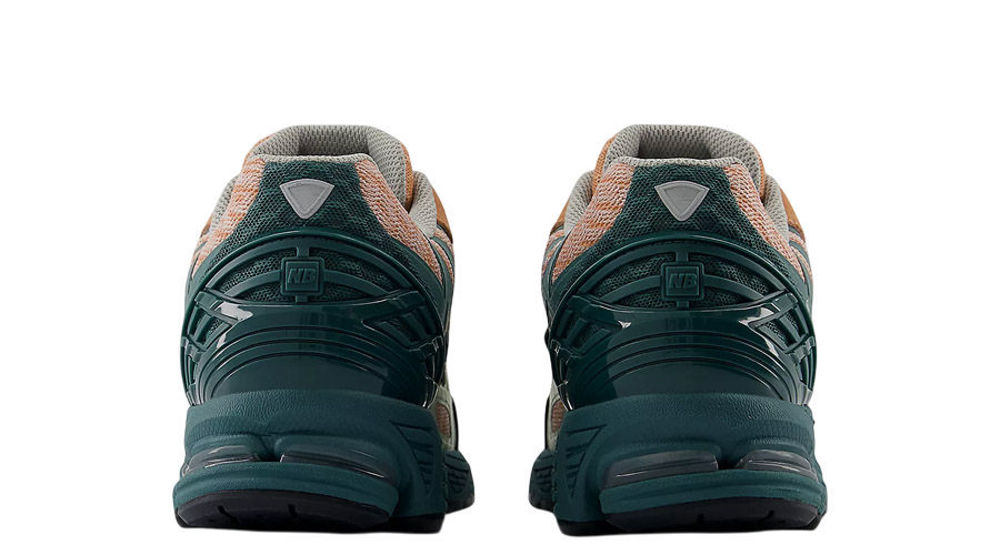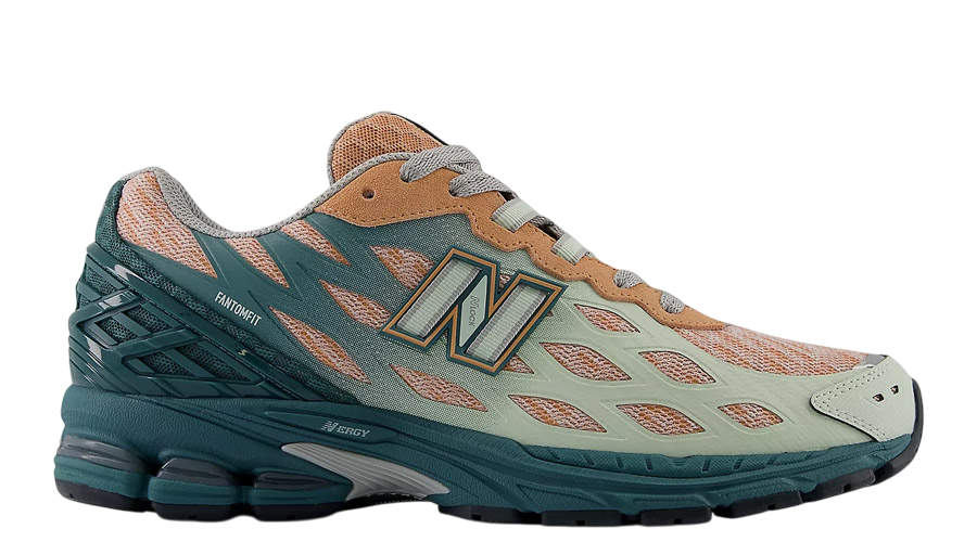 The 1906W showcases a vibrant “New Spruce” hue that dominates the midsole and heel counter, gradually transitioning into a “Natural Mint” shade towards the toe box. This gradient effect is complemented by “Light Sparrow” accents and an orange tongue, creating a visually appealing palette suitable for various occasions. The upper features a breathable honeycomb-patterned mesh with synthetic FantomFit overlays, providing both aesthetics and structural support.