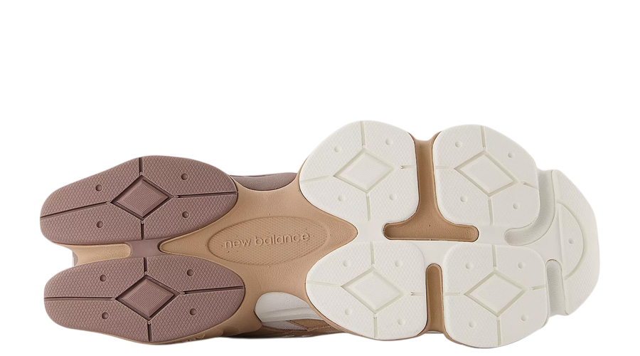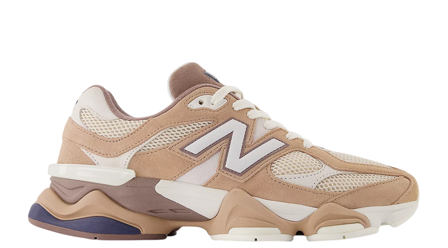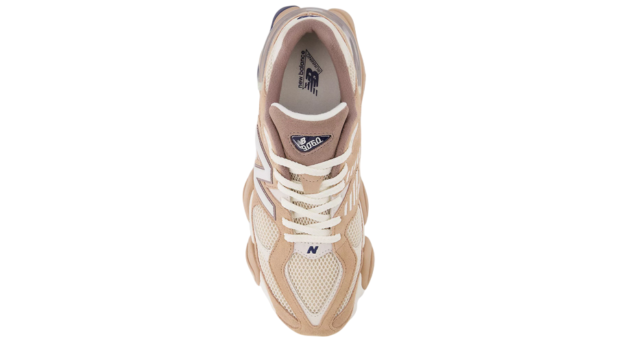 This “Earth Shadow” edition layers soft taupe suede over breathable bisque mesh, creating a light base that contrasts beautifully with the darker tones. Hits of deep blue highlight the tongue, heel, and midsole, adding subtle depth without disrupting the calm, grounded theme. The sculpted pod midsole — one of the defining features of the 9060 — carries New Balance’s signature ABZORB and SBS cushioning, providing a plush, supportive underfoot feel. The sway bars, borrowed from the iconic 990, run throughout the upper in exaggerated form, giving the shoe a sense of motion even while standing still.