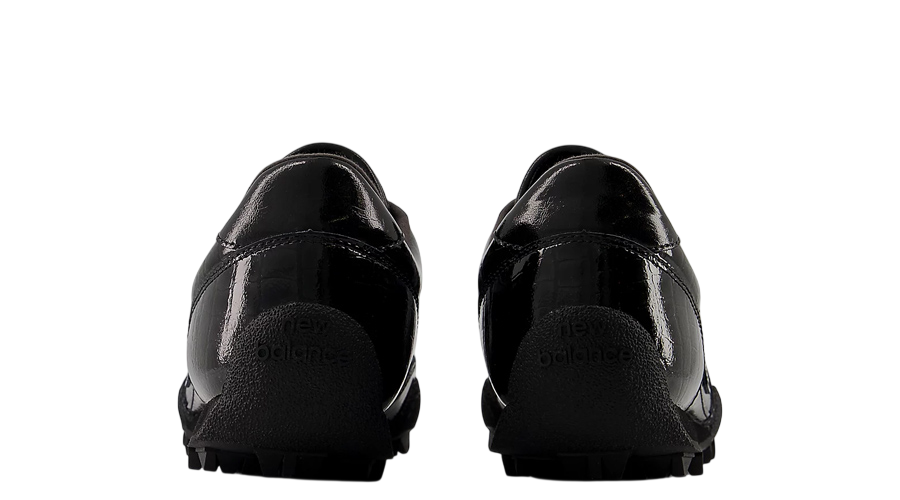The shape is sleek and low to the ground. Very old-school. It works perfectly with cropped trousers, loose denim, or track pants. The upper is where things really shine. Black patent leather wraps the shoe, finished with a debossed crocodile print that gives it texture without pushing too hard. It feels premium. Clean, but far from boring.