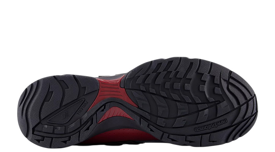 Up top, the mix of red mesh and perforated red leather sets the tone. The forefoot stays bright and open, while a curved window beneath adds texture and depth. Side panels stack red ripstop between black leather strips, giving the shoe a layered look that feels fast. At the centre, the black N-Lock logo sits clean and confident.
