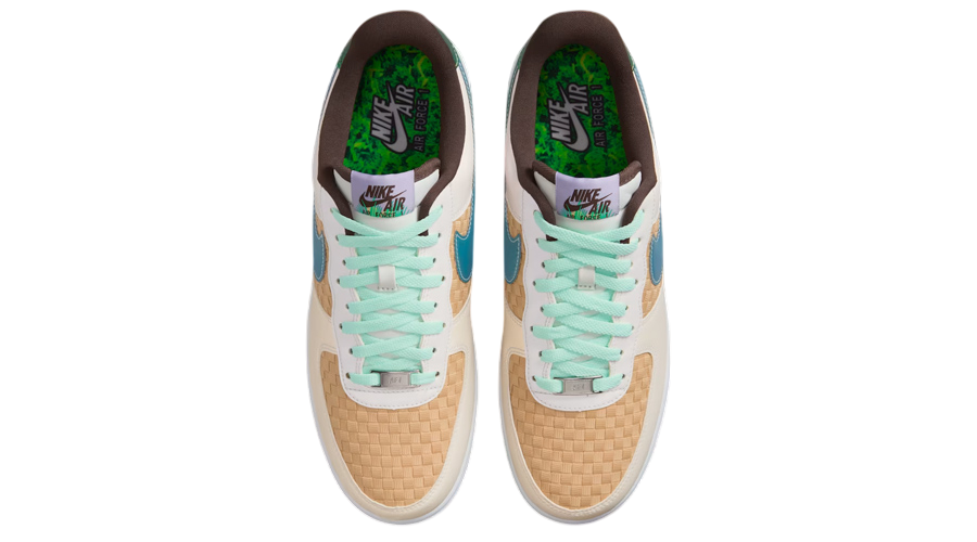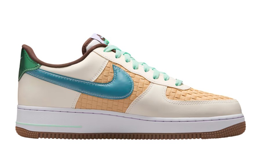 The woven brown underlay gives off an Easter basket vibe, while beige overlays keep the overall look grounded and stylish. Adding a pop of colour, the metallic blue Swoosh stands out against the neutral tones, complemented by the glossy green rear tabs and mint laces. Small reflective elements around the eyestay and Nike branding add a touch of shine, making these kicks stand out even more.