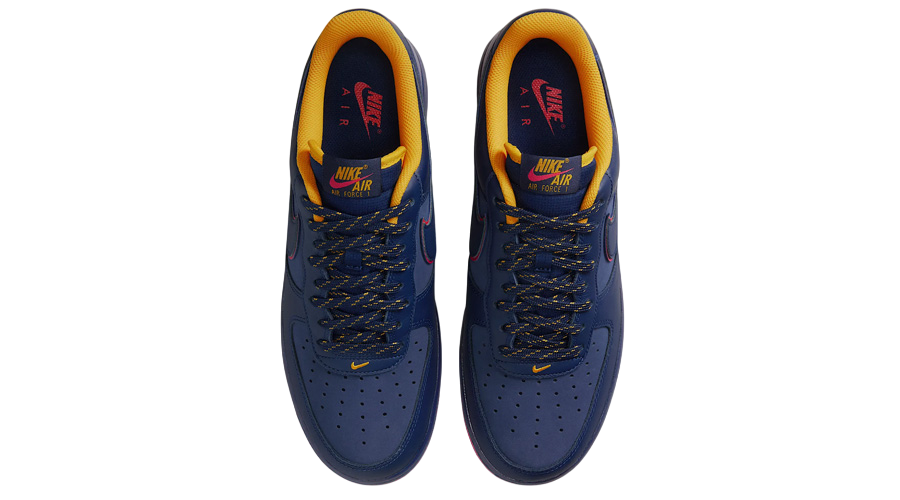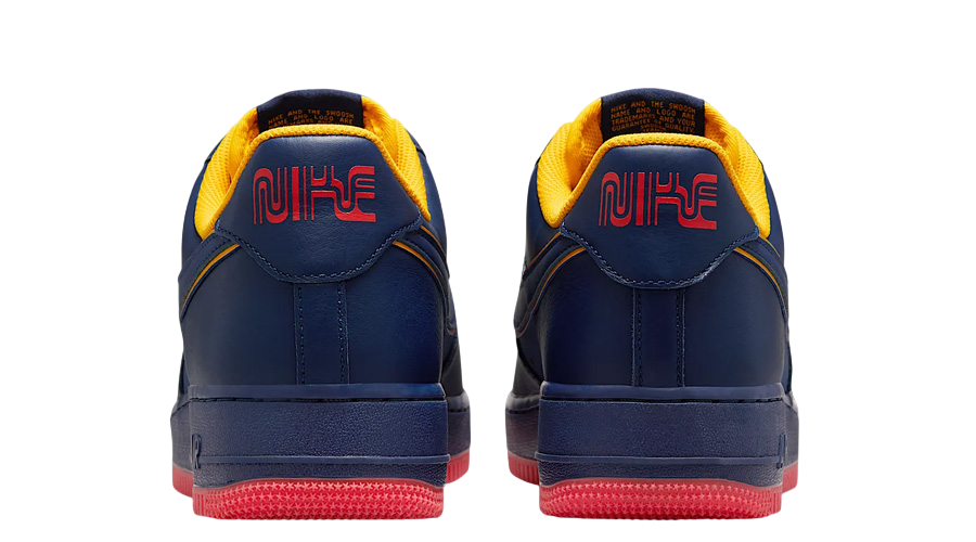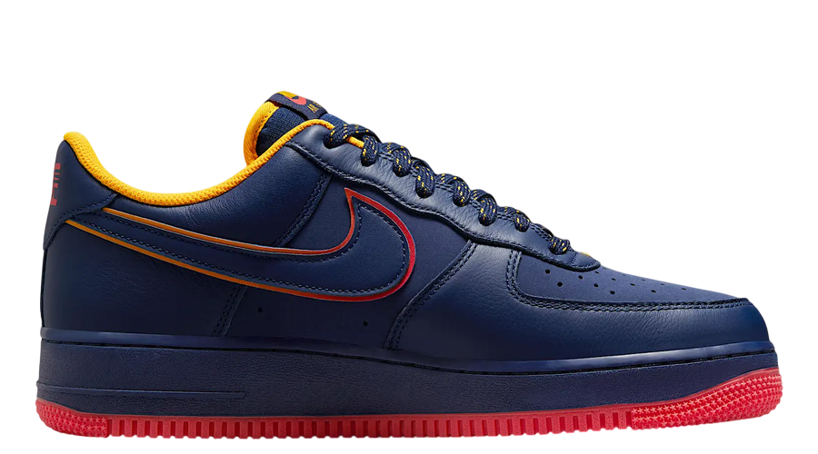 Nike reintroduces a classic with the Air Force 1 Low “Retro Pack Navy Gold,” a colourway that brings vintage aesthetics to one of the most iconic sneakers ever made. This version of the AF1 makes an instant statement with a deep navy nubuck underlay, contrasted by smooth leather overlays that add texture and depth. The standout feature is the vibrant red-to-orange gradient outlining the Swoosh, injecting energy into the retro-inspired design. Gold accents appear on the mesh lining, embroidered Swoosh on the toe, tongue branding, and speckled laces, completing the bold yet nostalgic look.