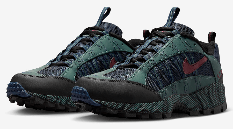 This Nike Air Humara “Faded Spruce” features a Dark Green base with Obsidian accents on the cables. Maroon adorns the Nike Swoosh and Nike labels on the upper.
