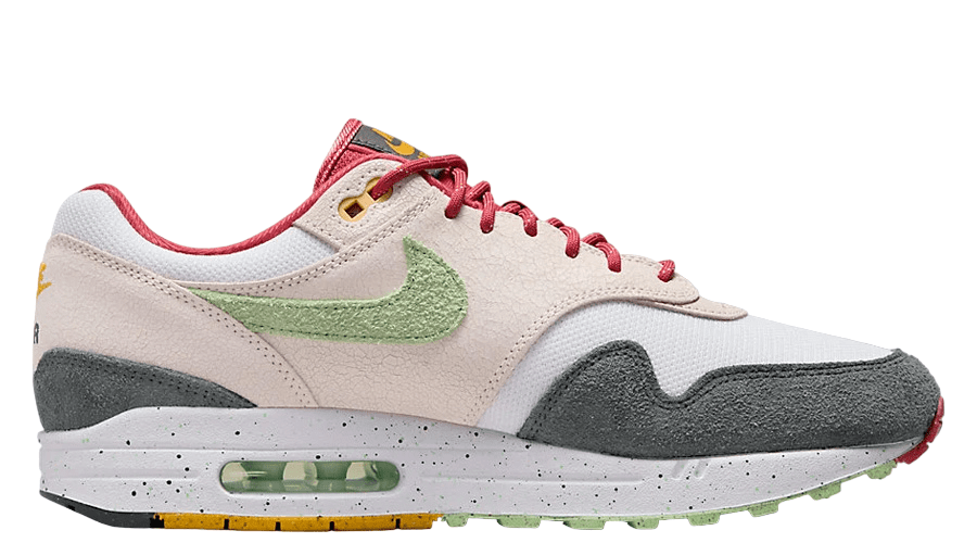 Stepping into the season with a fresh and vibrant vibe is the Nike Air Max 1 “Cracked Multi-Colour” FZ4133-640. This edition artfully blends an array of spring-inspired hues, featuring light soft pink, vapor green, anthracite, adobe, and university gold, set against a crisp white backdrop. The sneaker’s construction is a harmonious mix of premium materials, showcasing mesh and suede in a way that elevates both comfort and style.