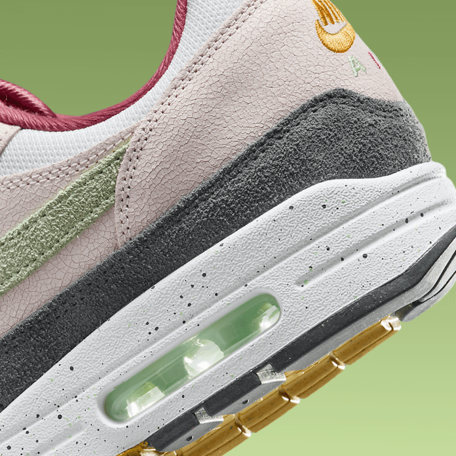 These pastel elements are contrasted sharply by anthracite mudguards, grounding the sneaker’s otherwise ethereal palette. Vapor green swooshes add a refreshing pop of colour, echoing the lively spirit of spring.