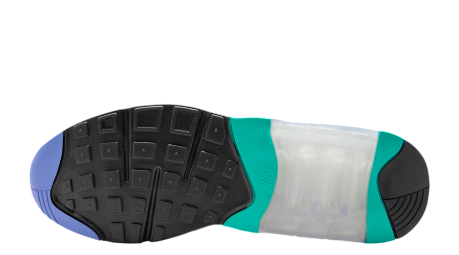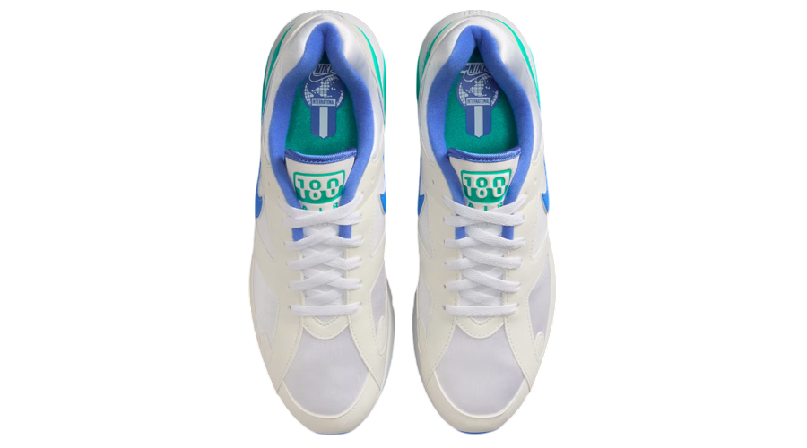 Nike sticks close to the original blueprint, building the upper with crisp white nylon and creamy off-white suede. Periwinkle blue accents light up the Swoosh, lining, and tongue piping, while Clear Jade hits on the heel counter, tongue logo, and signature 180-degree Air unit inject vibrant contrast. That heel wrap doesn’t just look sharp — it houses the full-length Air cushioning that helped set the 180 apart when it first launched.