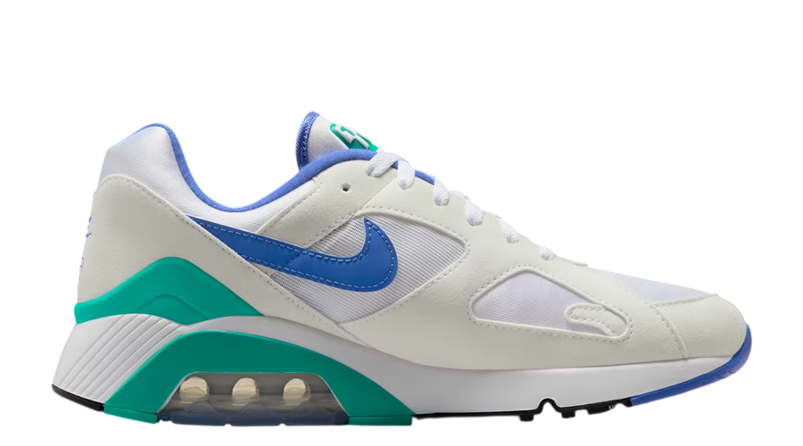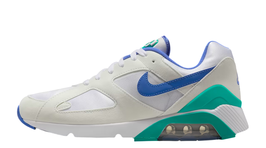 The Nike Air Max 180 “Bluebird” storms back onto the scene, bringing fresh energy and a heavy dose of early ’90s nostalgia. This silhouette holds legendary status in the Air Max family, remembered for pushing design boundaries when it first dropped in 1991. Now, for the first time in years, Nike pulls it back from the archives and delivers a colourway that’s bound to stir memories: White, Medium Blue, and Clear Jade, wrapped up in the unmistakable “Bluebird” look.