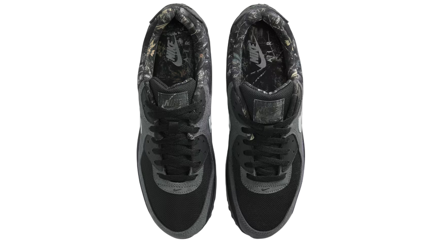 The upper mixes black leather and mesh with Dark Smoke Grey suede panels at the quarter. It gives the shoe depth without pushing too hard. Tree camo print appears sparingly on the lining, collar, tongue tag, and insoles. You barely notice it at first. Then it clicks. A nice touch that adds personality without changing the overall vibe.