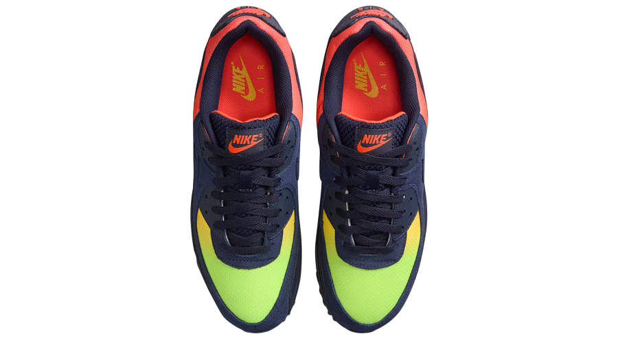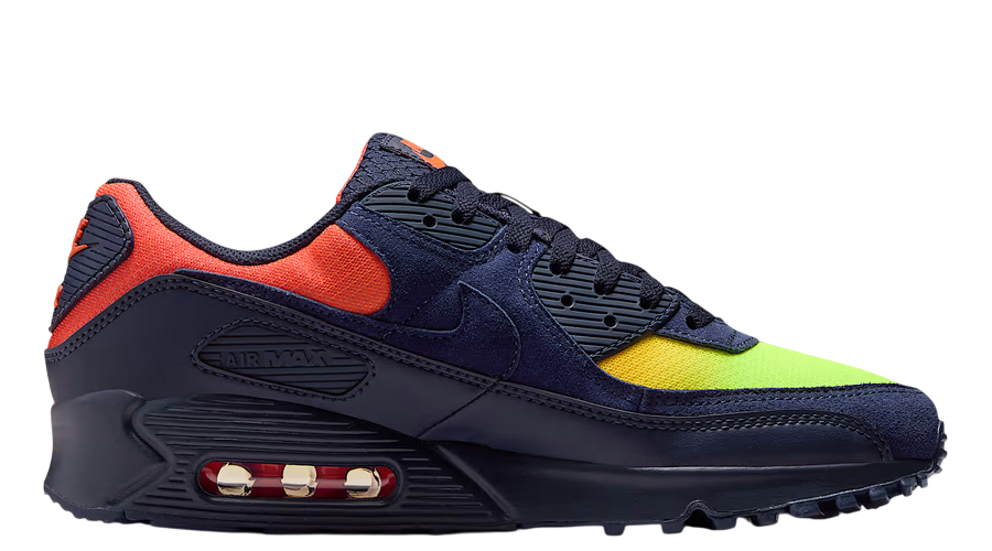 The Nike Air Max 90 “Gradient” puts colour front and centre, blending vibrant tones with a classic build. A burst of “Lemon Venom” hits the mesh toe box and fades into rich “Laser Orange” before shifting to “Hyper Crimson” around the collar. These colours echo the bold energy of the late ‘90s TN line, but here they sit comfortably on the more structured Air Max 90 frame.
