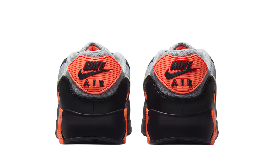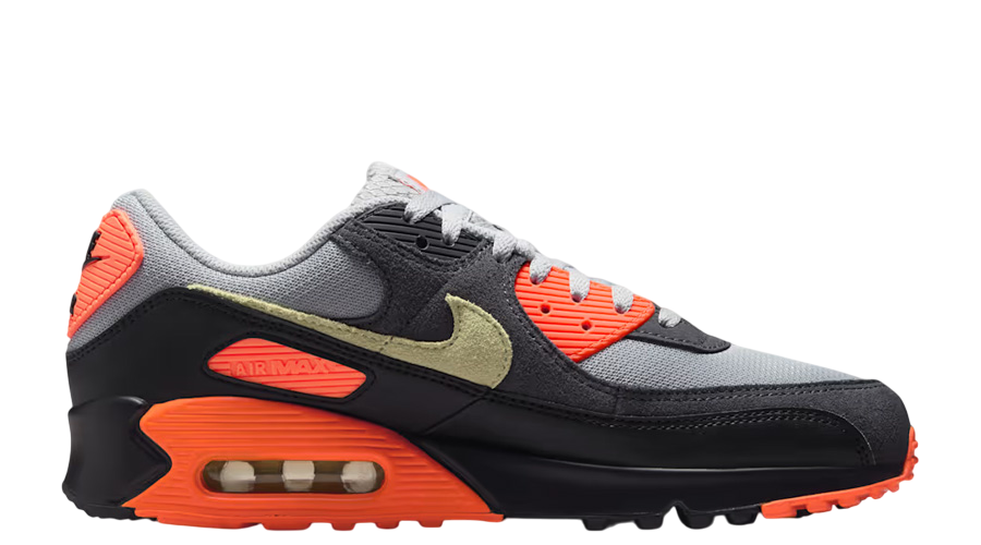 This colourway strikes a balance between subtle and standout. A mix of Smoke Grey tones covers the leather mudguard, mesh base, and dark grey quarter panels, giving the shoe a clean, neutral base. Then comes the pop — Hyper Crimson accents lighting up the TPU eyelets, heel badge, and lining. It’s a nod to the beloved “Infrared” palette that defined the Air Max 90’s legacy but with a modern, edgier twist.