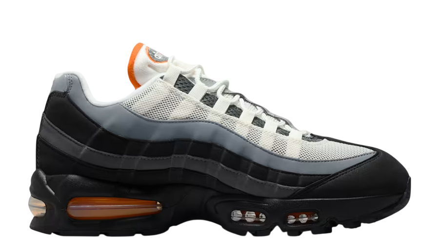 The Nike Air Max 95 “Black Bright Ceramic” brings a smart blend of classic lines and fresh colour hits. It holds on to the layered look fans love, mixing black and grey panels with a reflective strip along the top. The base feels familiar, but the details keep things interesting.