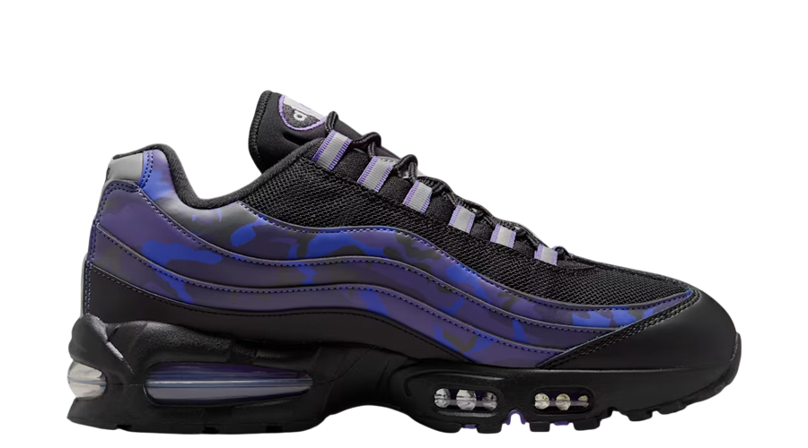 Nike gives the Air Max 95 a striking new look with the “Court Purple Camo,” a release that merges classic DNA with bold graphic details. The upper trades the model’s familiar suede gradient for camo-printed leather sidewalls, layered in deep black with Court Purple and Wild Grape accents. A black toe cap, tongue, and midsole add balance, while reflective hits across the lace loops, tongue cover, and heel spine light up under the right conditions.