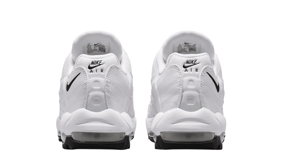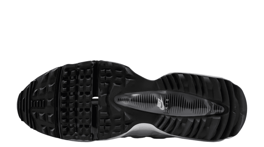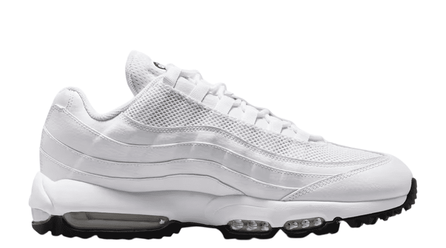 The upper arrives in clean white and black. Simple. Sharp. Easy to pair with modern golf fits. Synthetic leather replaces traditional mesh, adding structure and weather resistance while keeping that classic Air Max 95 shape intact. It looks familiar from the clubhouse to the car park.