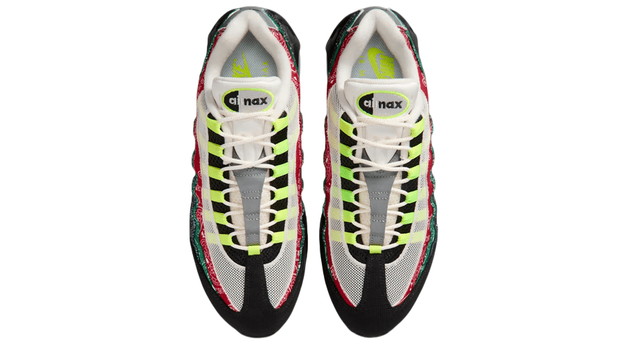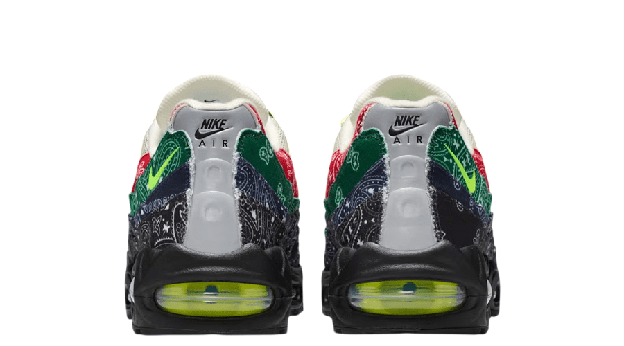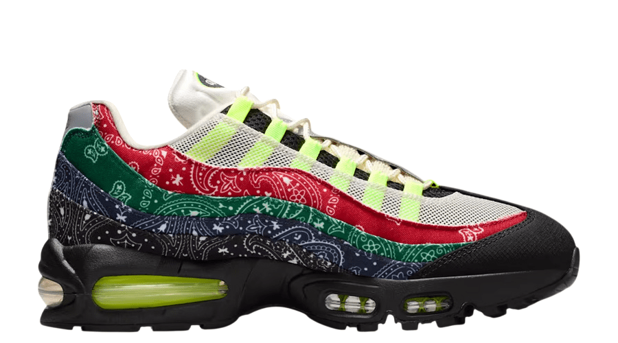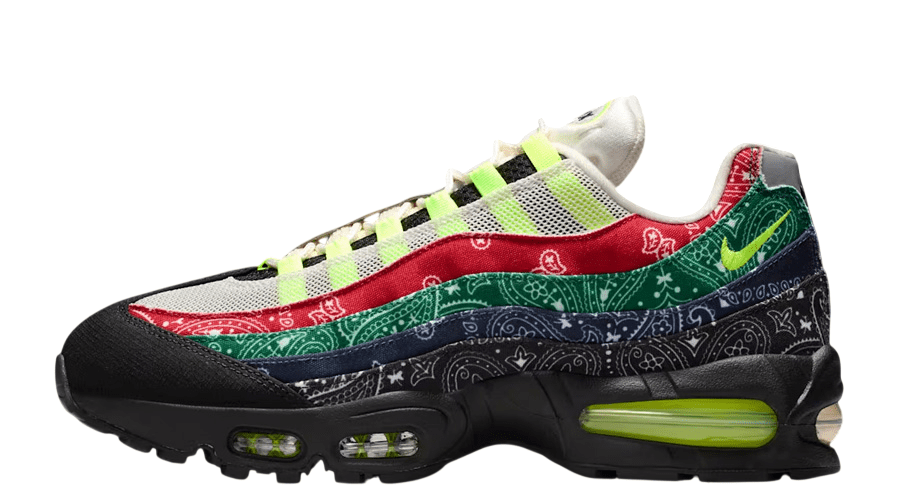 The layered sidewalls swap subtle shading for stacked paisley patterns in red, green, blue, and black. It’s loud. Graphic. A clear nod to street culture. Yet the trim stays loyal to the original Air Max 95 DNA that UK collectors rate so highly.
