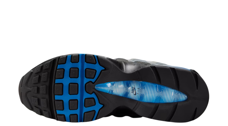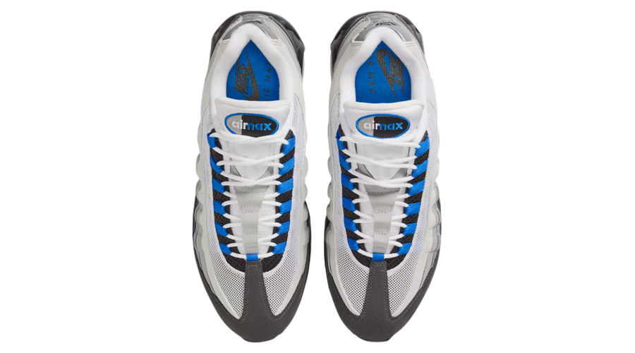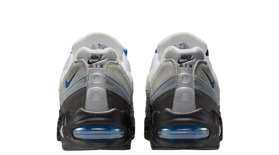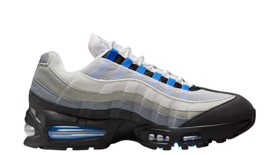 The Air Max 95 OG “Blue Spark” sticks to the formula that’s made this silhouette a fan-favourite for decades. It starts with the signature gradient side panels, shifting from dark greys at the base to crisp white mesh at the top. A black midsole grounds the look, letting the vibrant blue accents stand out. That vivid “Blue Spark” pops on the lace loops, Swoosh branding, and the exposed Air units, adding an electric contrast that modernises this classic runner.