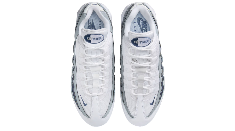 The upper starts with a crisp white mesh base, layered with soft greys and Diffused Blue tones that flow across the wavy side panels. The palette calls back to the classic “Slate” colourway from 1995 but adds its own identity through refined gradients and smoother transitions.
