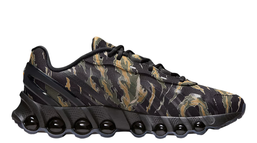 Nike continues to push the boundaries of its Air Max range with the upcoming Air Max DN8 “Tiger Camo.” This edition makes full use of the silhouette’s ability to showcase bold graphics, layering a striking camouflage print across the mesh base, synthetic skin, and toe-cap. The pattern delivers a sharp, military-inspired finish that stands out against the jet-black heel clip, inner lining, and tuned Air midsole. Every detail reinforces the shoe’s statement look while keeping its performance-driven DNA intact.