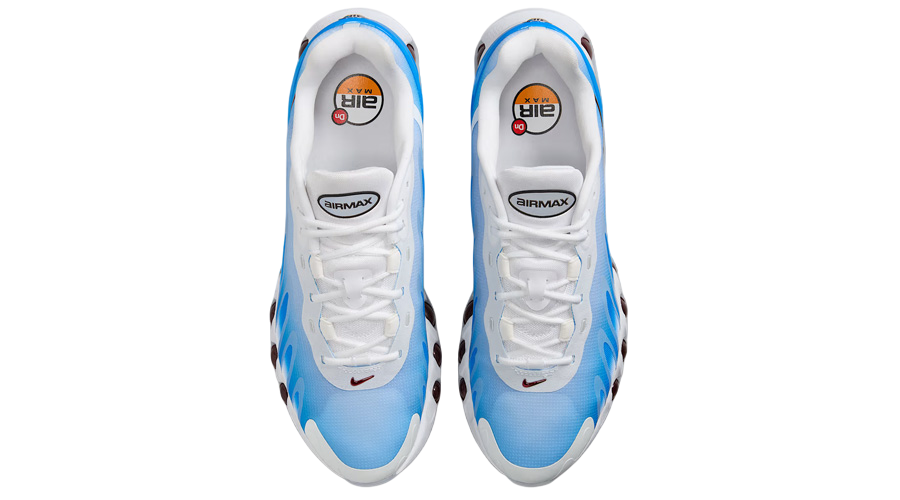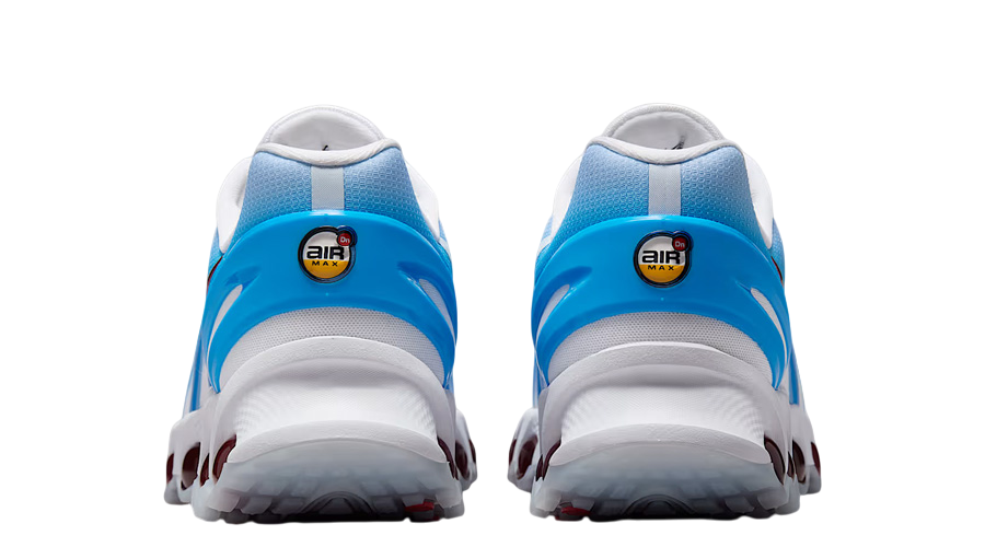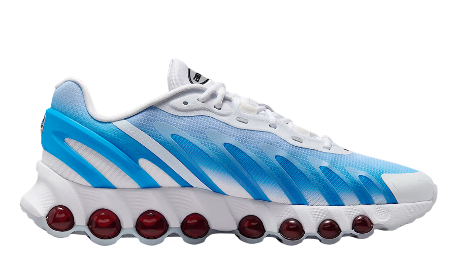 The lightweight mesh upper delivers a smooth gradient effect, blending soft blue hues that echo the calmness of the sea. Crisp white overlays cut through the blue like ocean waves, adding depth and motion to the design. Glossy red Swooshes and air bubbles introduce a bold contrast, while hints of yellow brighten the look with Dn logos on the heel and insole.