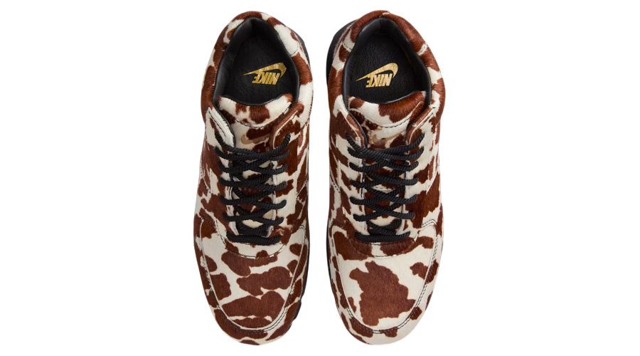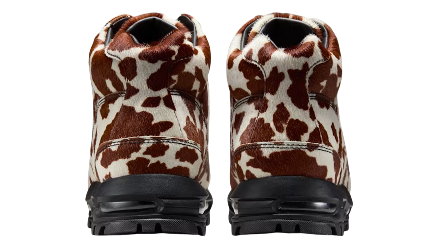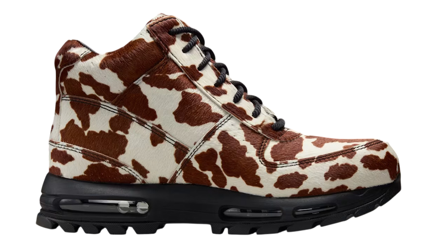 The Cow Print edition of the Nike Air Max Goadome brings a loud, playful twist to a model known for its toughness. This version stands out instantly thanks to the pony-hair upper. The cream base sits under bold brown markings that stretch from the toe right through to the heel. It feels plush to the touch and gives the shoe a look you don’t see every day. If you like footwear with character, this one hits that note right away.