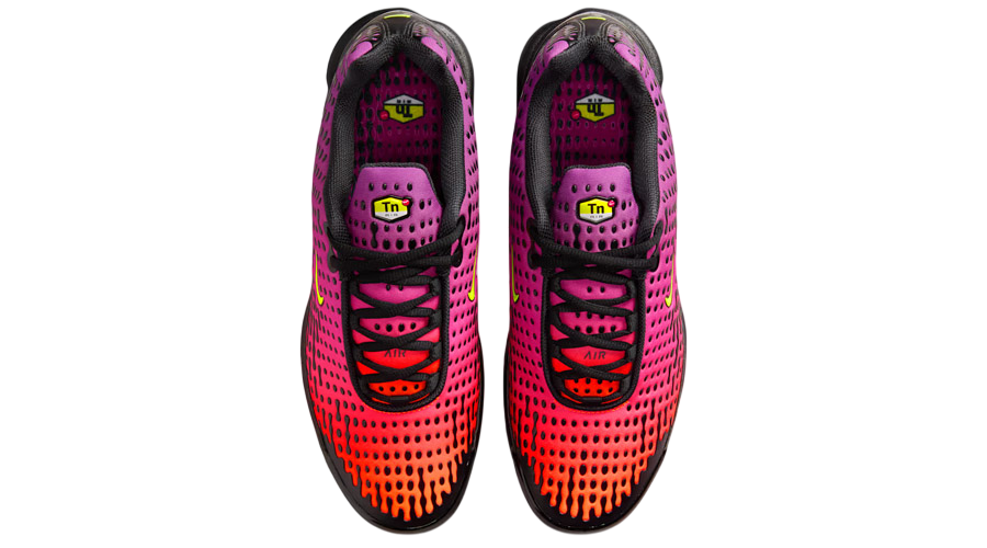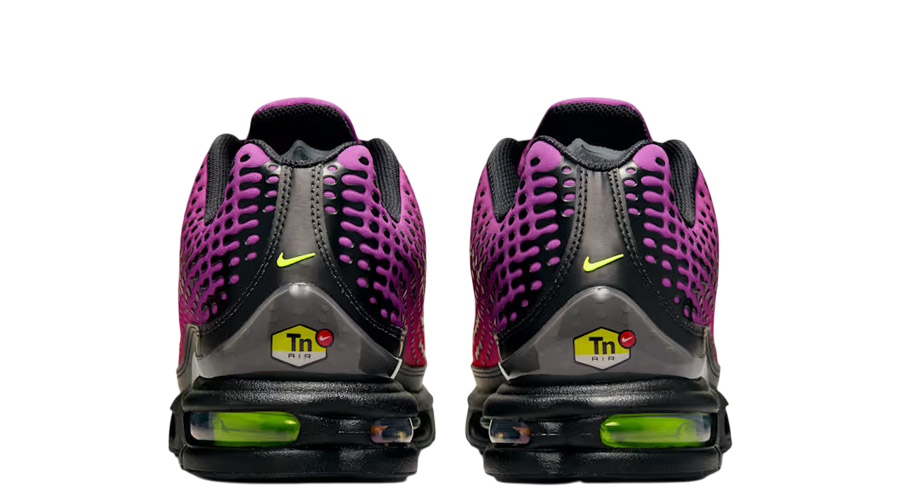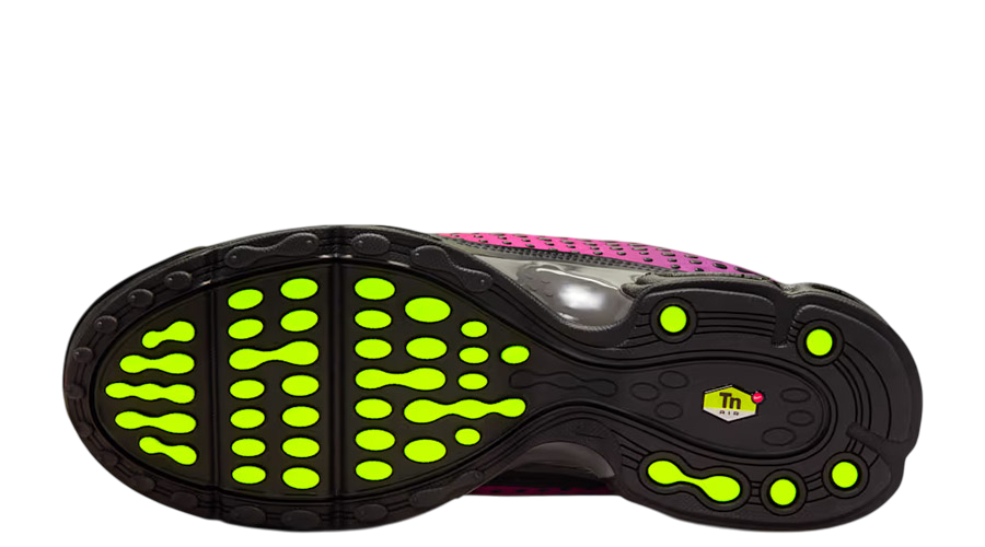 Black overlays sweep across the base, adding structure and a tougher feel. They frame the gradient well and give the shoe its signature edge. A glossy toe cap adds extra cover up front, while the synthetic mudguard wraps the lower half for protection in high-wear spots. Little flashes of volt on the Swoosh and TN logos break through the darker tones, adding just enough contrast.