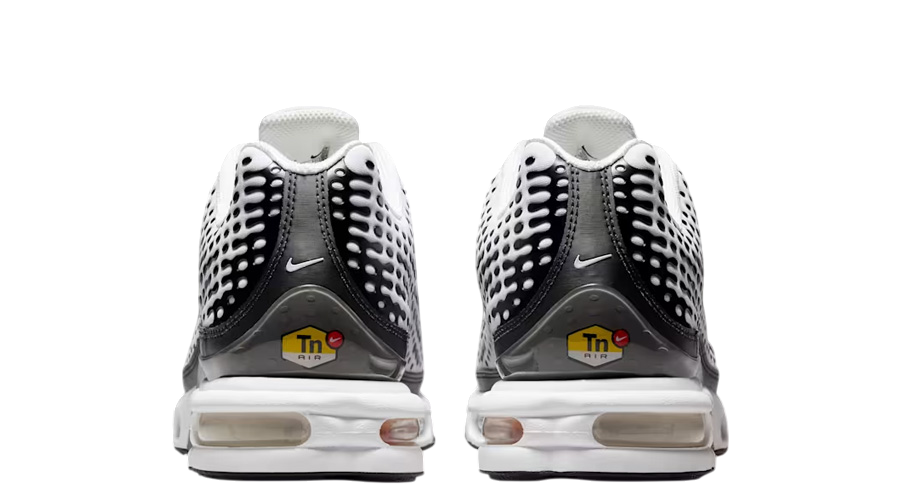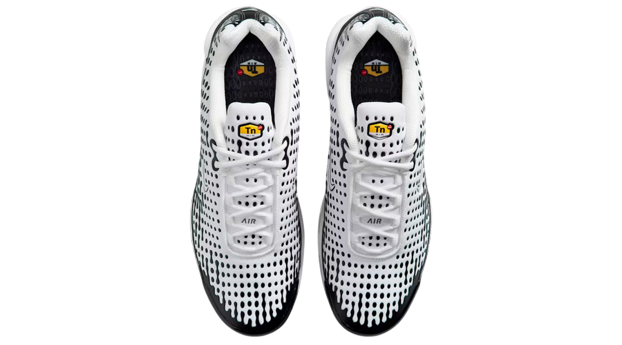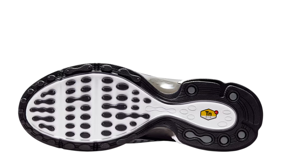 The upper comes in crisp white mesh, lightweight and breathable, while black TPU overlays sweep across the sides for that signature wavy look. It’s sharp, modern, and instantly recognisable. A glossy toe cap and synthetic mudguard reinforce the build, adding structure without weighing things down. The signature Swoosh hits both sides in understated style, joined by the yellow TN badge on the tongue, heel, and sockliner — small details that true collectors will spot instantly.