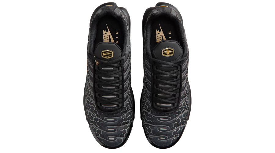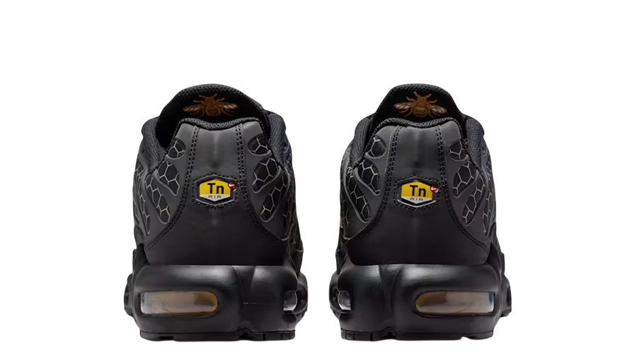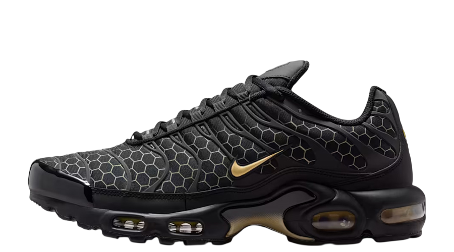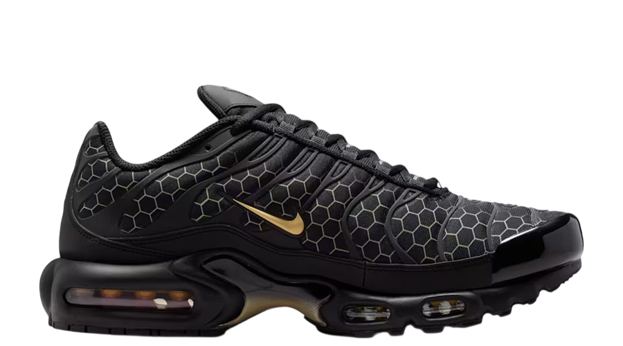 The Nike Air Max Plus “Honey” pulls straight from the city’s worker bee identity. The upper is layered with a gold hexagonal print that mirrors a beehive pattern. It sits over a black base, giving the pair a sharp black-and-gold finish that feels bold but wearable. Clean enough for daily use. Loud enough to stand out.