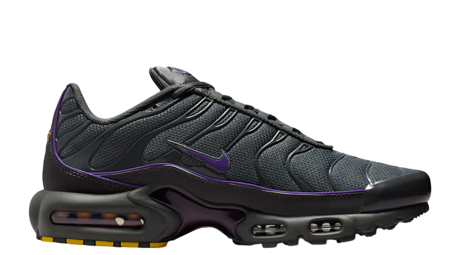 The Nike Air Max Plus “Iron Grey Wild Grape” lands with a calm look at first, then flashes with small hits that catch your eye. The shoe sits under a full “Iron Grey” shell, giving it a clean, smoky tone that works with just about anything.