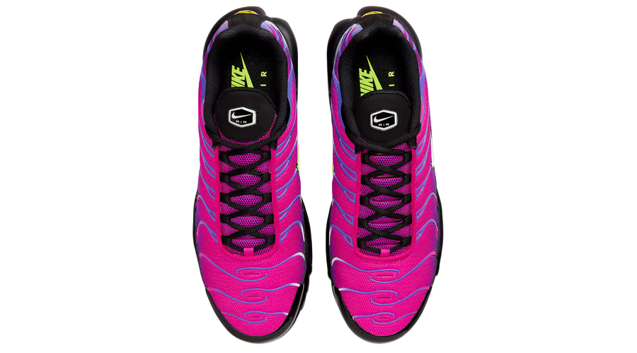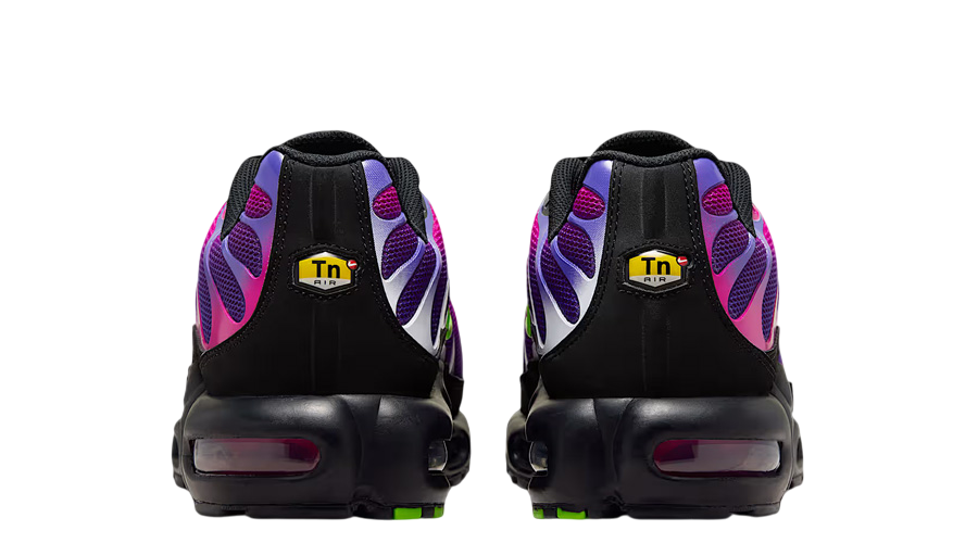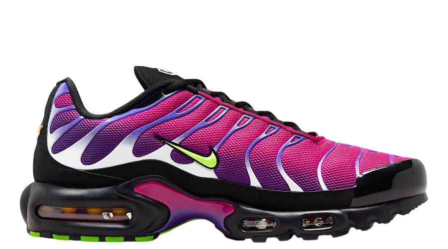 The Nike Air Max Plus “Rebellious Air” demands attention with bold colour blocking and aggressive detailing. Fireberry and Pure Purple clash across the breathable mesh upper in a sharp gradient that sets the tone. On the lateral side, black TPU overlays push through the pink base, while the medial side flips the contrast—white lines cut across and bring the Volt Swoosh to life.
