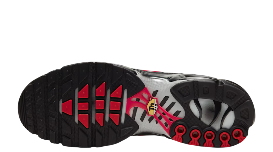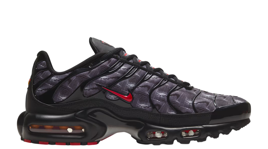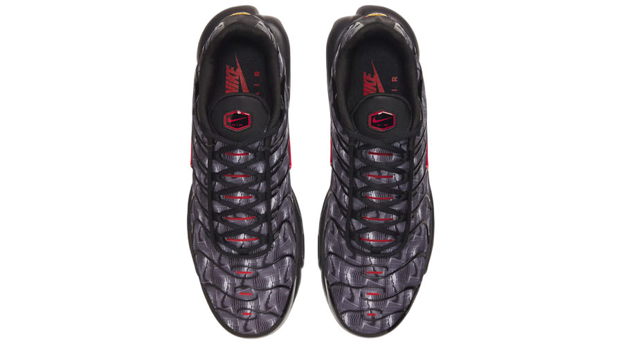 Across the mesh upper, you’ll spot a graphic inspired by topographic patterns. It feels layered. It feels busy in the best way. Tiny Swooshes spread through the print, giving the shoe a sharp, street-ready edge without overloading it. The classic wavy lines from the Air Max Plus stay present, so fans of the OG shape will feel at home.
