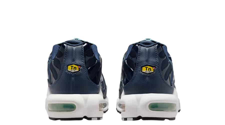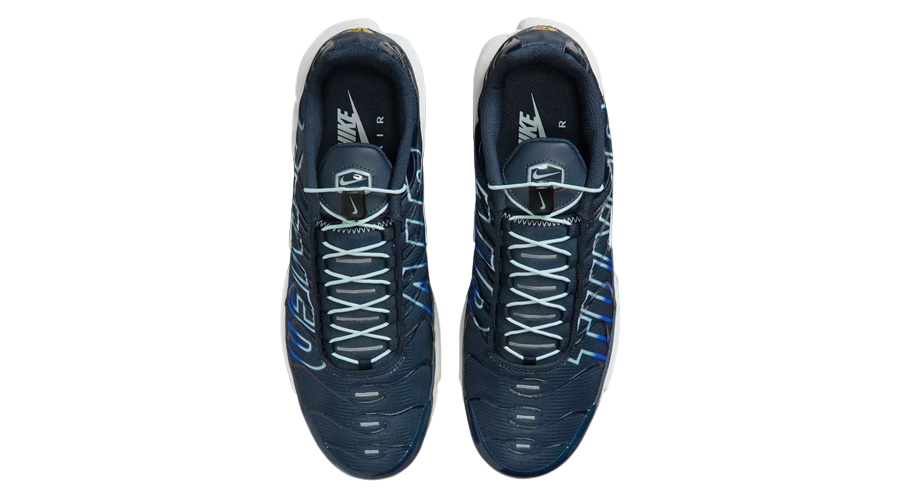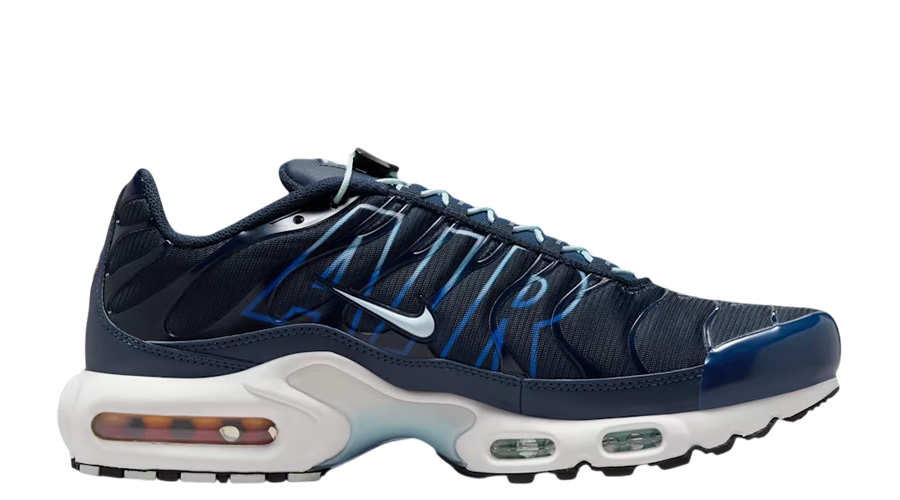 Nike sticks to its roots with a deep Obsidian base. You’ll see it across the mesh upper, tongue, sockliner, and that wrap-around mudguard. But it’s the oversized “Tuned Air” text, blasted across the sidewalls, that steals the spotlight. This bold branding fades from Glacier Blue to Comet Blue, delivering that gradient-style pop that TN fans instantly recognise.
