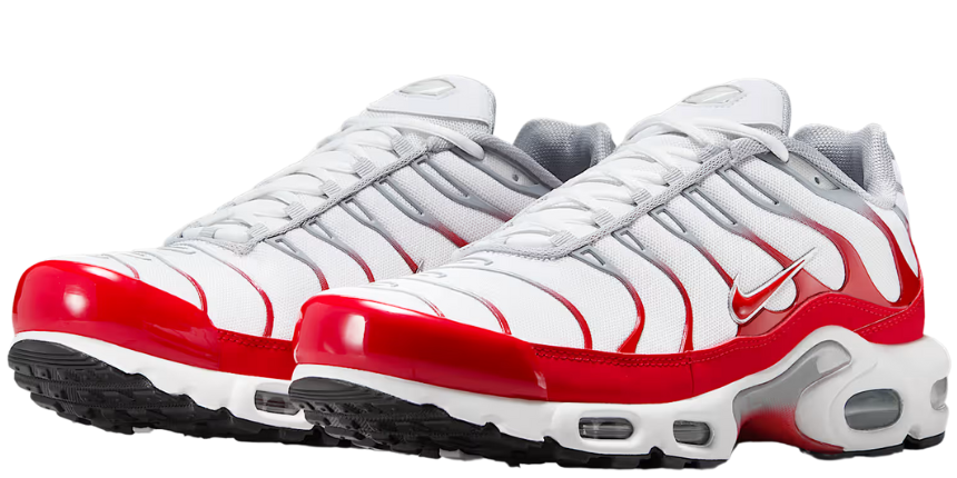 What really seals the deal is the contrast. The bright white upper, the vibrant red accents, the soft grey details — all balanced on top of a sharp black rubber outsole that grips confidently on city streets. This Air Max Plus isn’t just a nod to its 1998 origins; it’s a bold statement, bridging decades of design evolution with an unmistakable attitude.