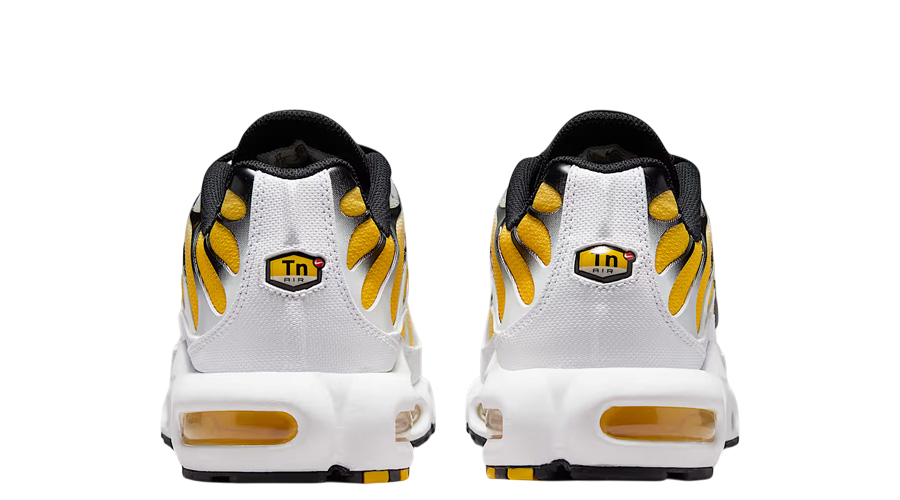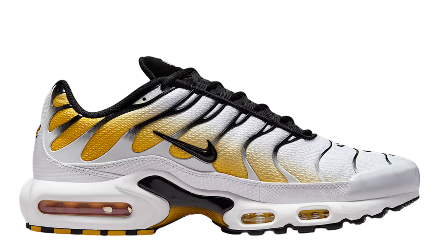 The Nike Air Max Plus “White Varsity Maize” brings fresh contrast to a silhouette that never fades. This version sticks to the blueprint—bold lines, visible Air, and attitude from heel to toe—but flips the palette into something lighter and louder at once.