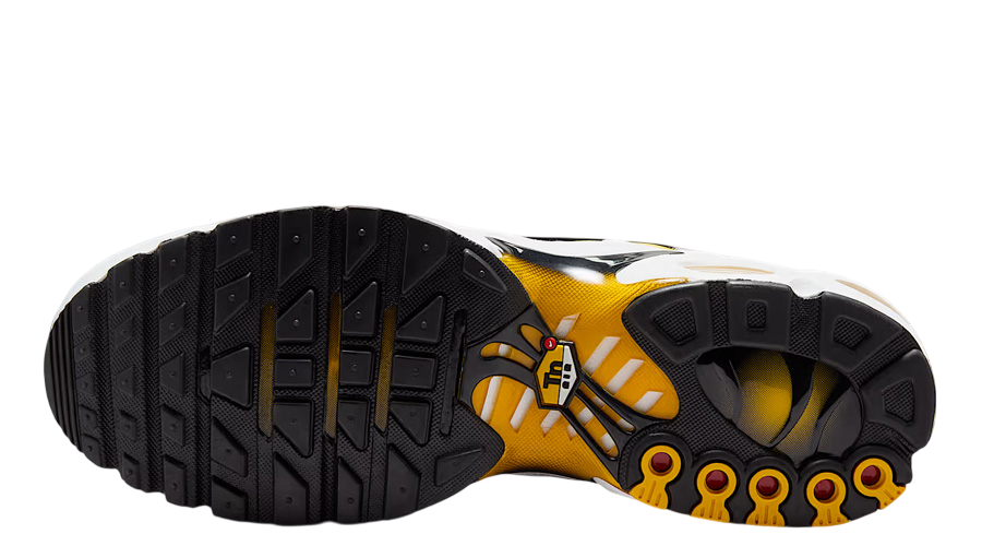 Bright yellow hits the back half of the upper, matching the Air units and TN badges. As you move toward the toe, the colour fades cleanly into white, creating a gradient base that feels sharp and seasonal. The black caging transitions in reverse—from dark to light—flowing top-down across the mesh and landing clean against the crisp white forefoot. It’s classic TN DNA, but with enough tonal shift to keep things moving.