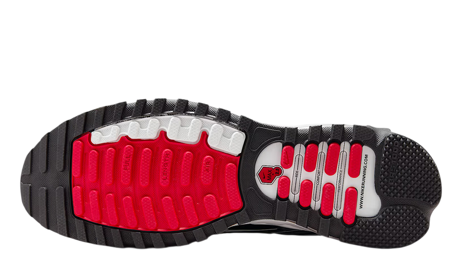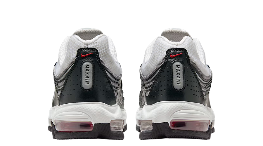 The upper pairs breathable mesh with glossy synthetic overlays, keeping the build lightweight while dialling up the throwback look. Nike runs Varsity Red through the Swoosh, heel accents, and visible Air units to add contrast to the white base and black detailing. You also get a white foam midsole and black rubber outsole—faithful to the original setup.
