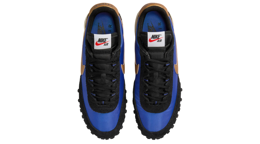 The Hyper Blue nylon upper keeps things lightweight, while black suede overlays provide structure and durability. Metallic Gold accents on the Swoosh and branding add a bold contrast, making sure this pair stands out. The mix of materials gives a nod to the Waffle Racer’s vintage aesthetic while staying true to modern sneaker standards.