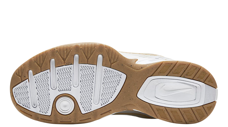 The upper stays true to the Monarch’s identity. White leather panels give the shoe a clean look, nodding faintly to snow-covered pavement. Stitched overlays offer structure, while perforations break up the bulk and let some air through. Along the side, the Swoosh appears in a ginger-toned brown—deeper than tan but lighter than chocolate—adding warmth to the layout.