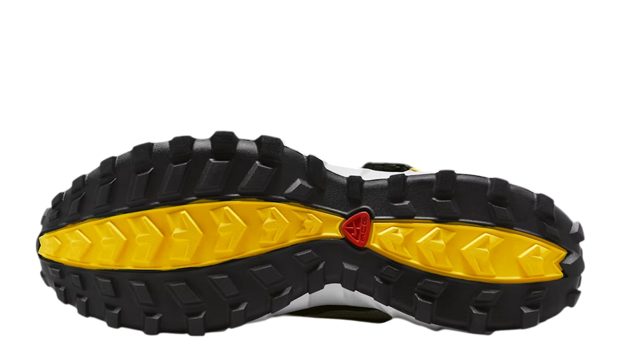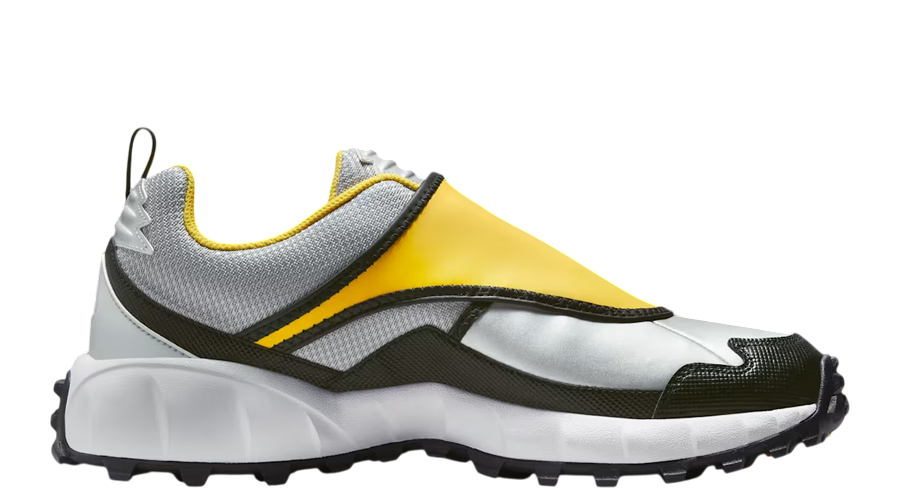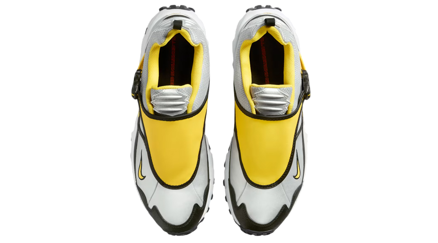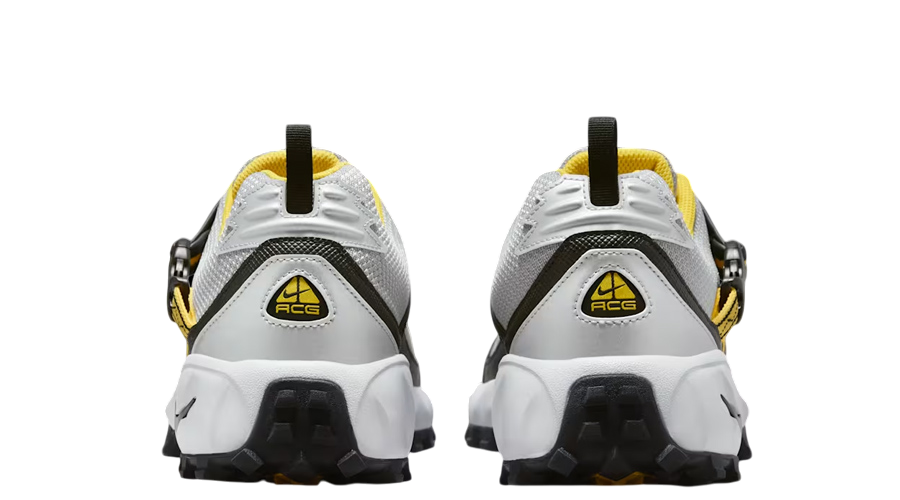 A breathable grey mesh base forms the foundation, layered with metallic silver high-density overlays for extra structure. Pops of Yellow Zest dominate the shroud, which draws inspiration from tent flaps and hides the laces for a sleek, protective finish. Black detailing on the mudguard and heel counter frames the bold colour palette, while ACG branding on the back panel and “All-Conditions Gear” labels nod to the line’s rugged heritage.