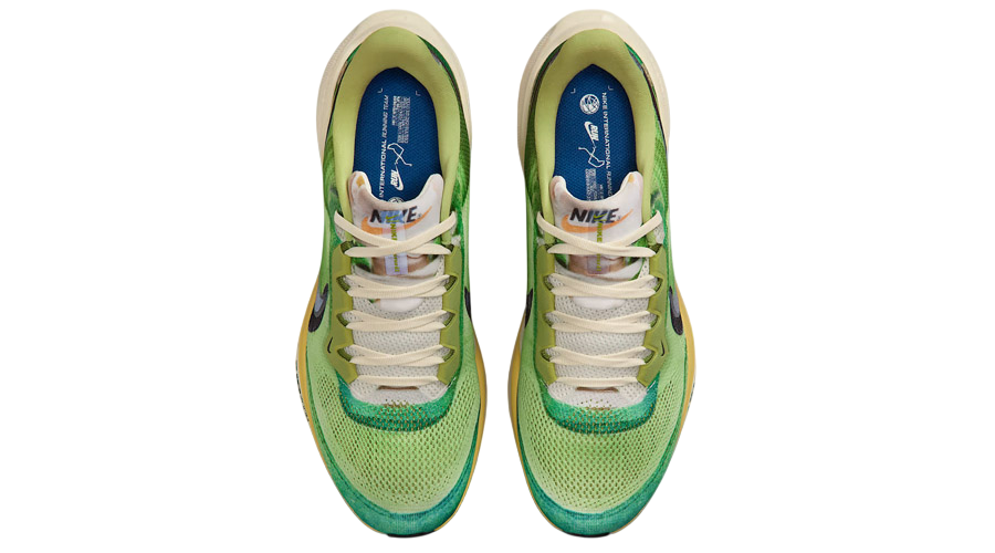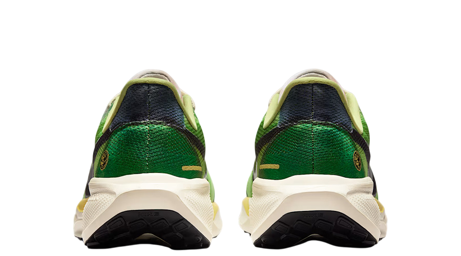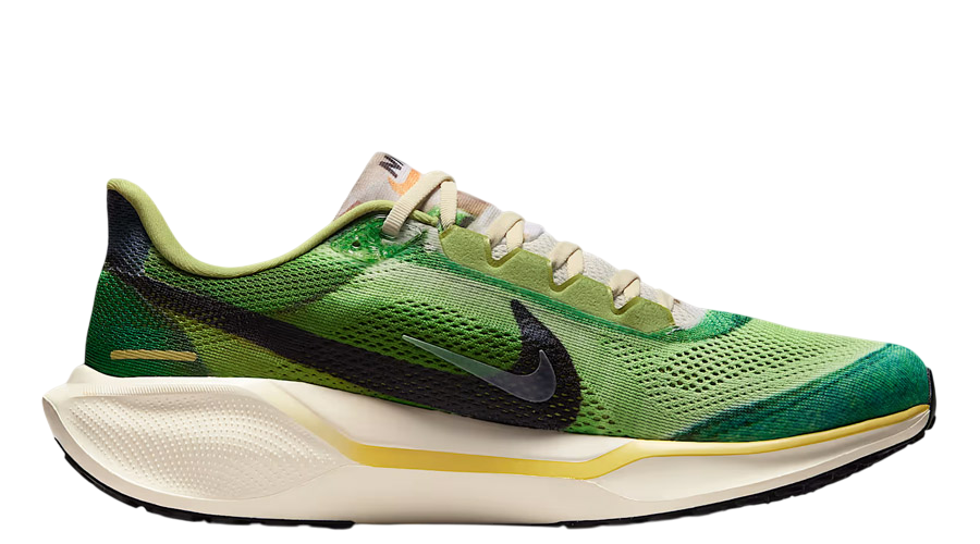 Nike continues its long-running Pegasus story with a special release that nods to the brand’s heritage. The Air Zoom Pegasus 41 International Running Pack takes direct inspiration from an original Waffle Racer colourway, blending archival design cues with the performance tech runners expect today. A vivid mix of “Vivid Green” and “Dark Apple” lands across the breathable mesh base, with added paneling over the toe and heel. A black Swoosh sits within the mesh, overlaid by a translucent Swoosh that adds depth to the design. A pre-dirtied tongue and pre-yellowed midsole bring a retro finish, echoing the worn-in look of classic Nike racing flats.