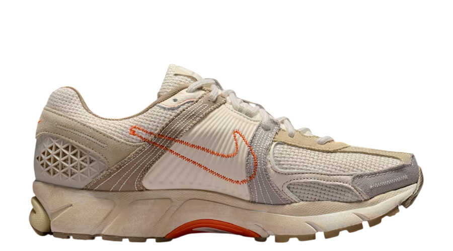 The Nike Air Zoom Vomero 5 “Muslin Pale Ivory” blends early-2000s running heritage with a worn-in, crafted finish that feels pulled from archive storage rather than a factory line. Four distinct materials collide across the upper — a woven hemp-style base sets the tone, overlaid with suede around the forefoot and heel for structure. Instead of the usual TPU cage, this pair opts for stitched canvas panels enclosing a leather frame, giving it a softer, aged profile.