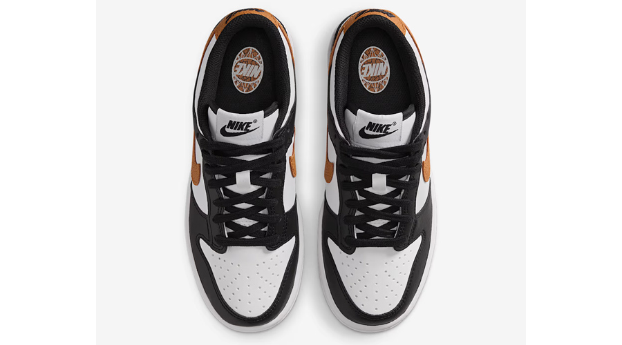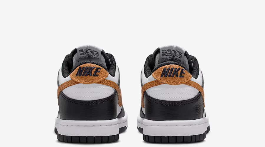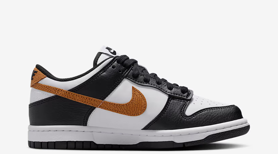 The Nike Dunk Low GS “Dry Desert” reimagines the classic Panda look with subtle but striking changes. At first glance, the familiar black-and-white blocking comes through, but closer inspection reveals earthy upgrades. The Swoosh and heel panel switch to a warm, sand-toned leather, giving the shoe its desert-inspired theme.
