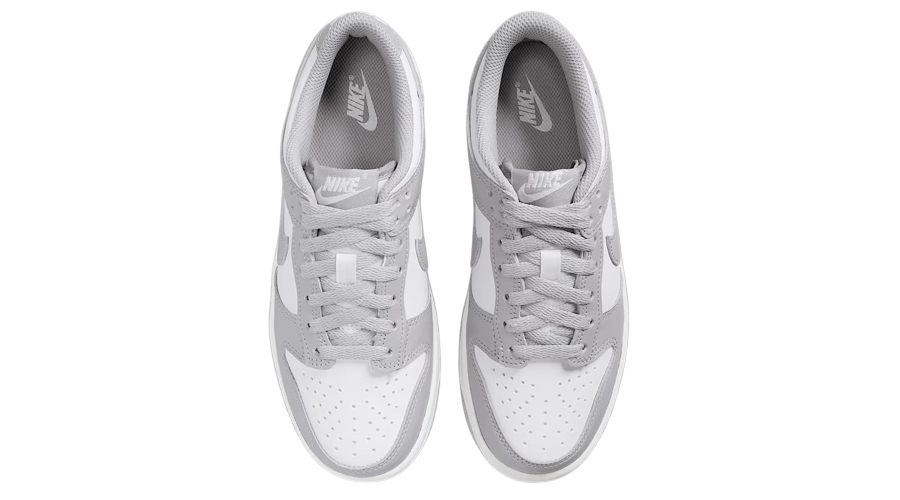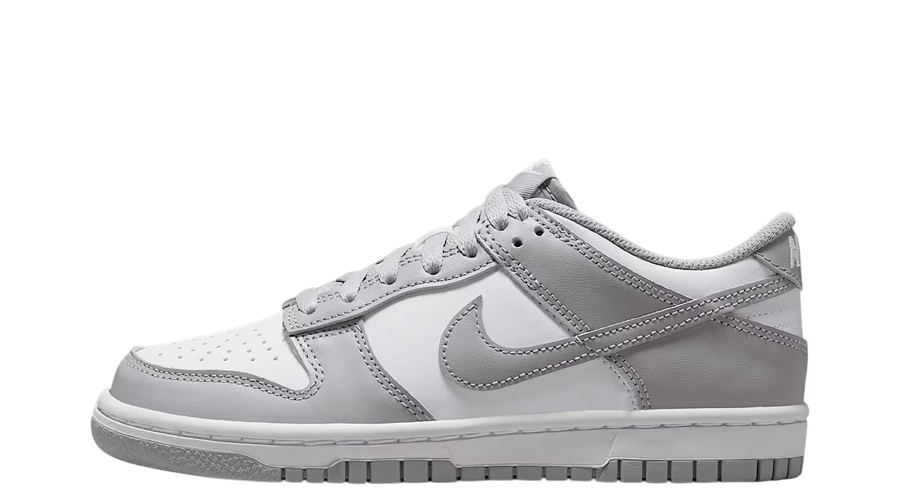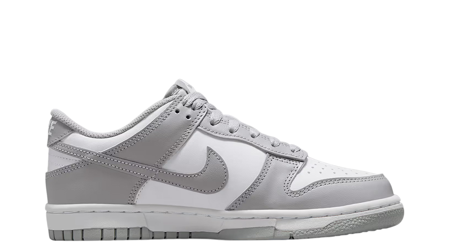 The Nike Dunk Low GS “Light Smoke Grey” brings subtle colour blocking to one of Nike’s most recognisable silhouettes. Originally built for basketball, the Dunk has since moved far beyond the hardwood. This version, scaled down for grade school sizing, blends soft grey overlays with a crisp white leather base, while black Swooshes cut through the side panels to add contrast. It’s clean, balanced, and easy to wear with just about anything.