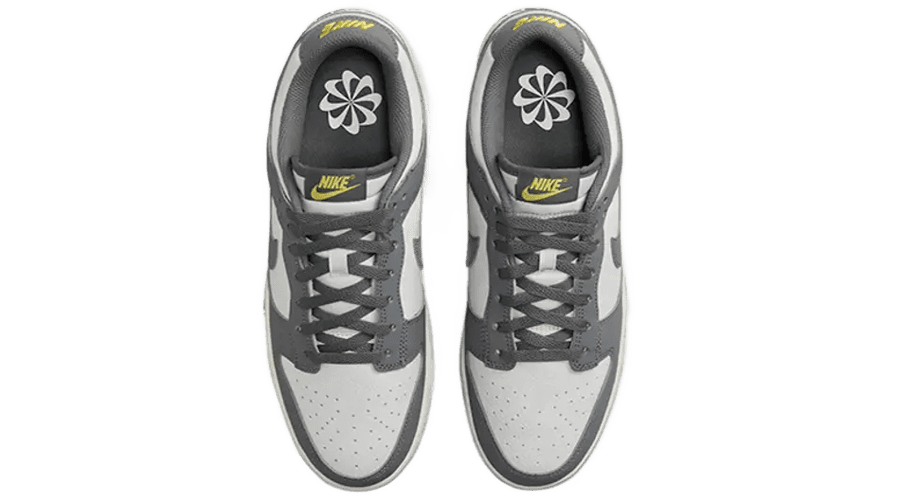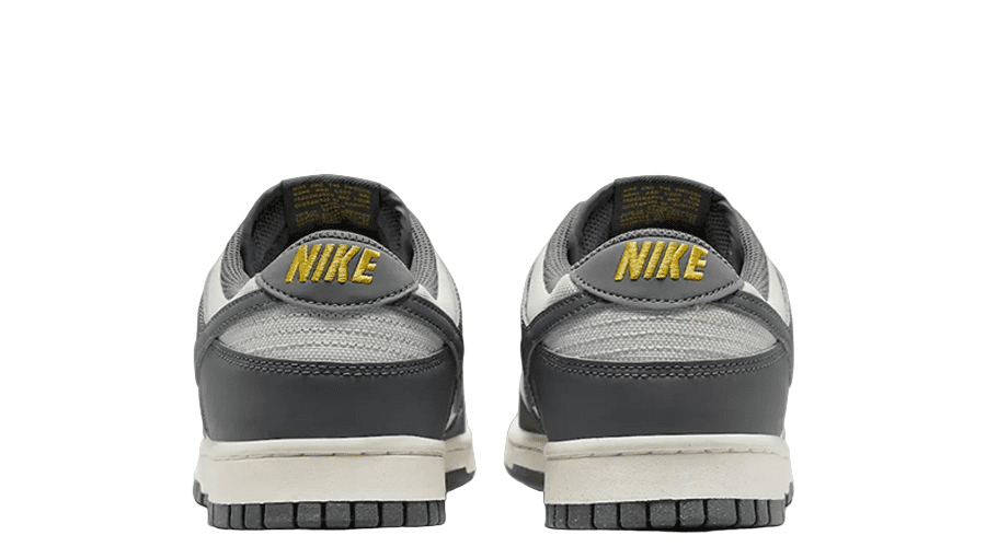 The colour scheme features Light and Dark Smoke Grey tones, creating a sleek and understated appearance. A white pebbled leather base forms the foundation, complemented by grey nubuck overlays on key areas. Golden Yellow accents on the Nike branding at the tongue and heel add a subtle pop of colour. For enhanced durability, canvas material lines the collar, ensuring these kicks can handle everyday wear.