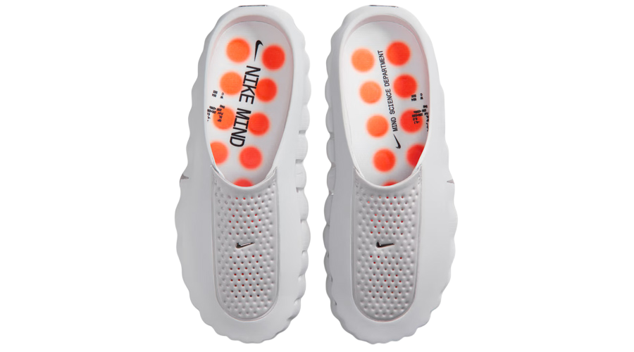 Textures play a big part here. The padded layers feel warm and cushy, and the dimpled finish adds depth to a silhouette that could’ve been plain. Thick ventilation ports on the medial side let air move freely, which keeps your feet fresh during long wear. Small details — like the orange circles across the footbed and the Mind Science Department graphics — add a story within the shoe, almost like hidden notes for those who care to look.