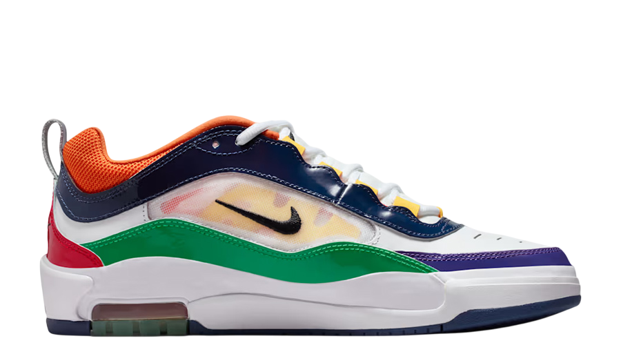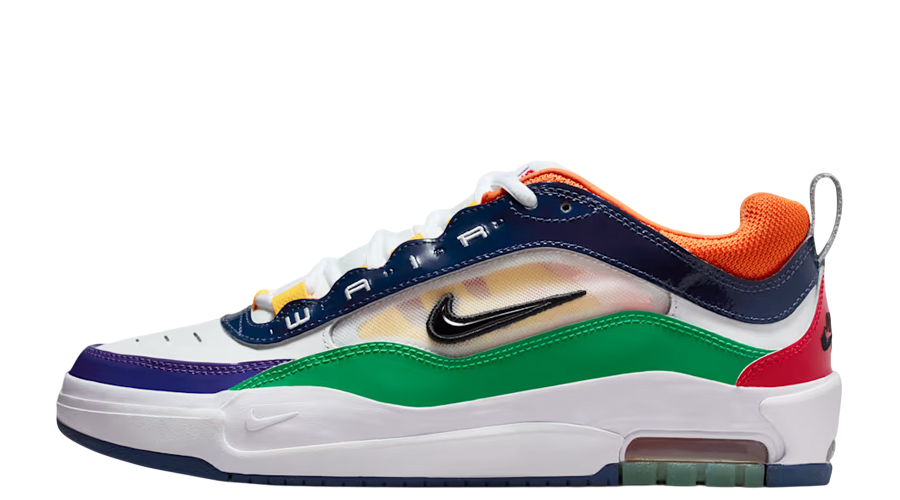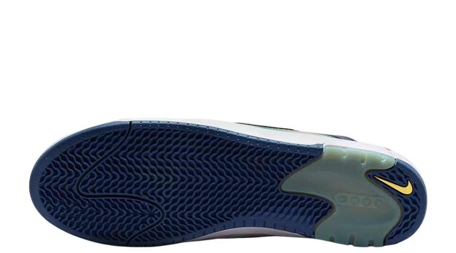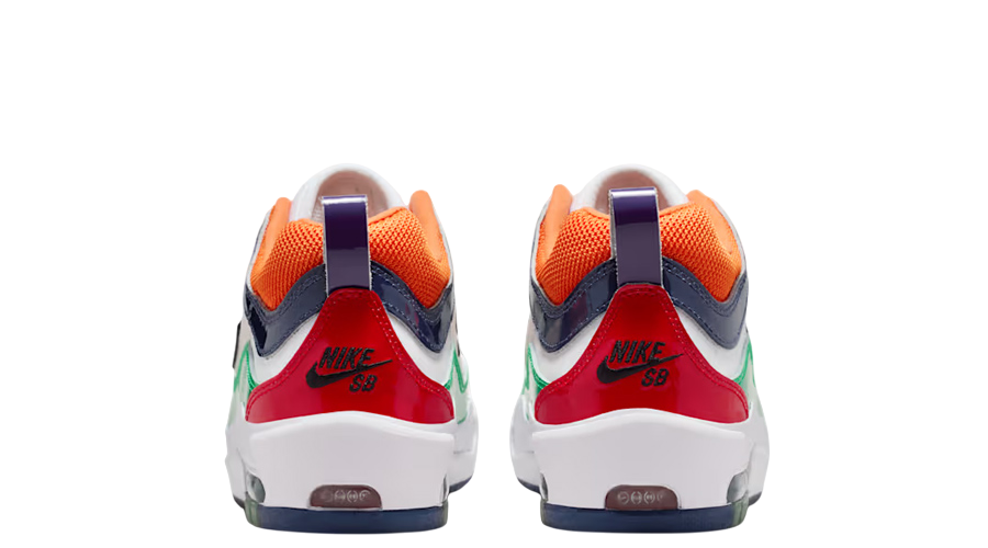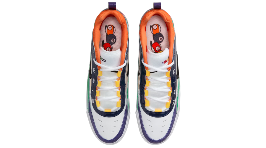 At first glance, the mix of white leather and semi-transparent mesh gives the shoe a clean yet layered look. Then comes the chaos — patent leather panels in blue, purple, green, and red bounce across the upper like billiard balls mid-break. Yellow eyelets and an orange liner throw in an extra spark, adding that unmistakable SB energy sneakerheads crave. A black Swoosh slices through the colours with confidence, grounding the design.