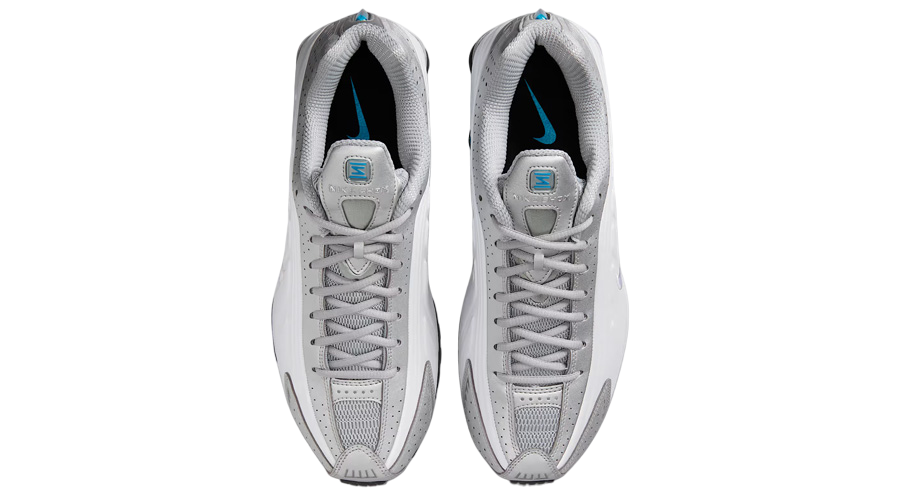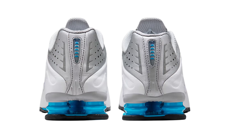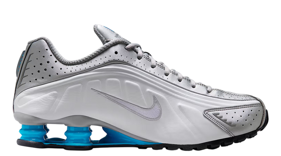 Nike brings the Shox R4 back with a clean “Blue Lagoon” edition that plays into the futuristic charm of the early 2000s while adding subtle, effective updates. This colourway sticks close to its roots, with white leather panels along the side and silver overlays that keep the upper looking sharp and slick. You’ll spot hints of blue on the tongue badge, heel Swoosh, and inside the Shox columns—just enough to lift the overall palette without overdoing it.