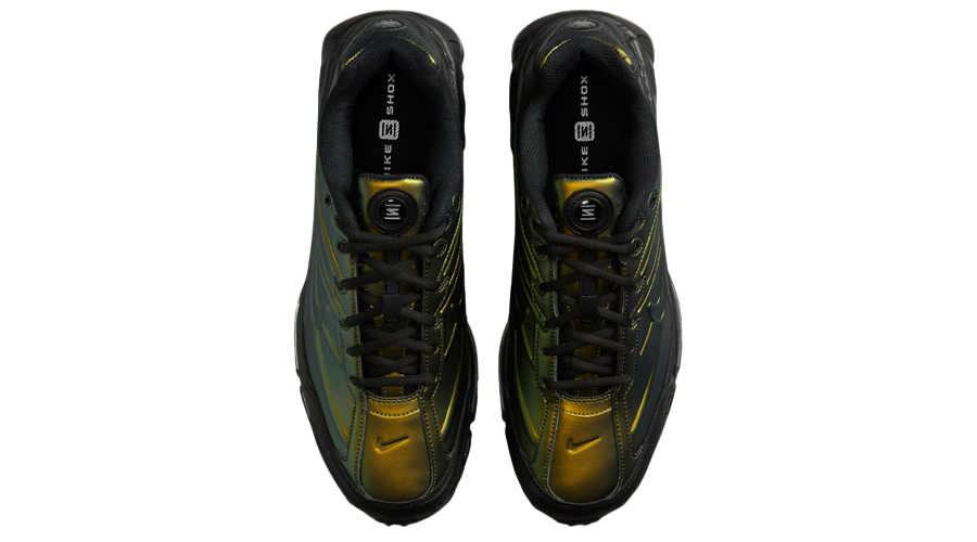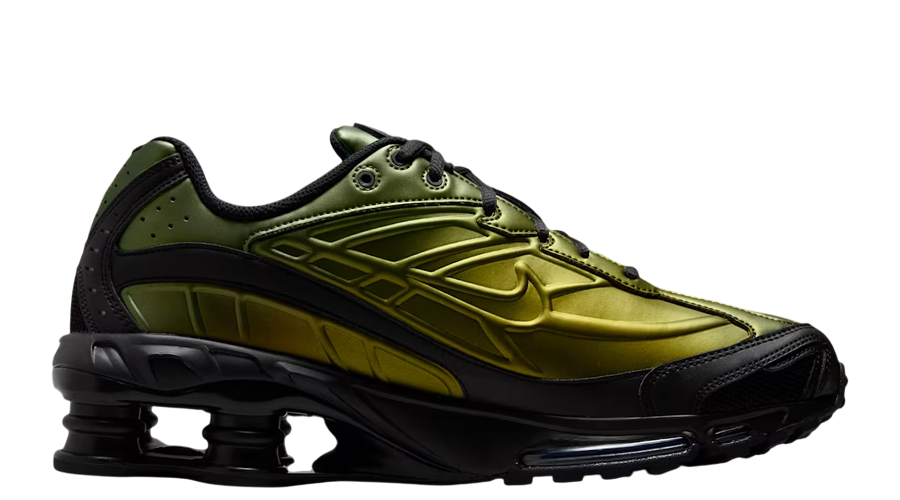 Nike’s Shox Ride 2 steps into the spotlight once again, this time with a rugged “Olive Flak” finish that draws inspiration from utilitarian gear and outdoor-ready designs. The silhouette keeps its aggressive DNA intact, with those unmistakable Shox pillars underfoot. But it’s the upper that commands attention here. A shimmering, moulded synthetic shell drenched in an iridescent green-gold hue gives this version a bold visual twist. Depending on the light, it shifts between earthy olive tones and a metallic sheen, adding an edge to a silhouette built for both nostalgia and performance.