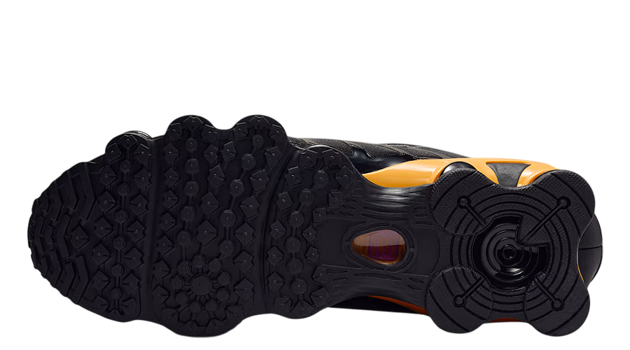 A glossy black mesh upper keeps things breathable but moody, wrapping around the foot with shiny TPU overlays for extra structure. The layered profile gives the silhouette its signature aggressive stance, while metallic silver Swooshes and reflective panels on the heel break up the darkness with sleek contrast. Hits of “Varsity Maize” appear on the Shox columns and lace loops, giving the colourway its punch. It’s a nod to bold sports colour palettes from the early 2000s—eye-catching but grounded.