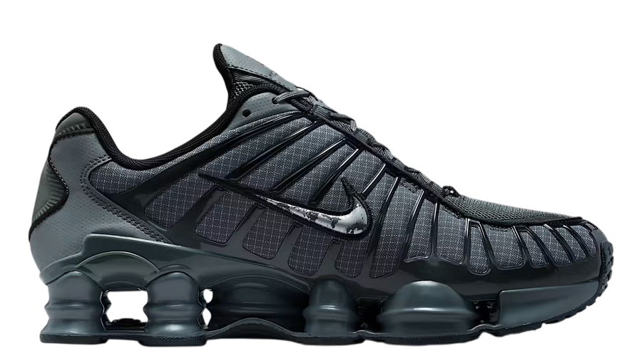 The Nike Shox TL “Iron Grey Black” revives a cult favourite from the early 2000s, staying true to its bold mechanical identity while refining the presentation through darker, industrial tones. The upper combines open mesh and glossy TPU overlays, building a layered, almost armoured structure across the foot. Rather than relying on loud colour pops, this colourway leans on contrast through finish — matte greys against polished blacks — giving the silhouette a stealth-like presence. Small Swoosh branding remains understated, letting the architecture of the shoe carry the visual weight.