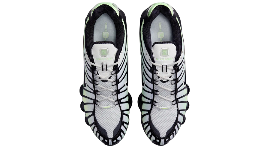 This version sticks with the signature piston-inspired sole, but Nike gives it a vivid twist. The lower portion dips into a soft ‘Barely Volt’ green that fades upwards into an off-white shade around the tongue. The mesh upper breathes well and keeps the fit light, while glossy black TPU overlays cut through the design with a sculpted finish. The combination of mesh, synthetics, and exposed structure gives it that unmistakable Shox attitude — part sci-fi, part street-ready.