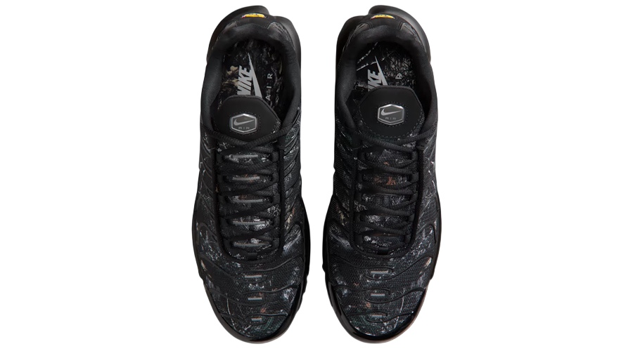The upper leans heavily into black, giving the shoe a stealthy base that works year-round. Look closer and the woodland camo pattern appears across the mesh. It’s subtle at first glance. Intentional on the second look. The camo brings texture and depth without breaking the aggressive TN shape.